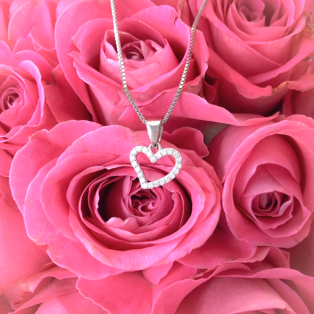 Här ett Sweethearts silverhalsband med ett sött hängande hjärta. Smycket behöver inte putsas eller blir missfärgat som andra silversmycken då det är Rhodiumpläterat vilket ger ett hållbart smycke med en exklusiv finish liknande vitguld eller platina. Runt om smycket finns många glittrande Cubic Zirkonia vilket är den syntetiska sten som allra mest liknar en diamant.