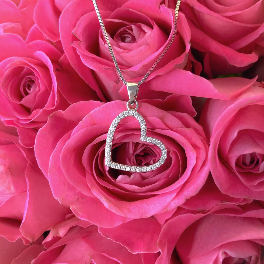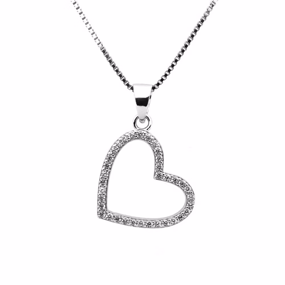 Här ett Sweethearts silverhalsband med ett fint hängande hjärta. Smycket behöver inte putsas eller blir missfärgat som andra silversmycken då det är Rhodiumpläterat vilket ger ett hållbart smycke med en exklusiv finish liknande vitguld eller platina. Runt om smycket finns en mängd glittrande Cubic Zirkonia vilket är den syntetiska sten som allra mest liknar en diamant.