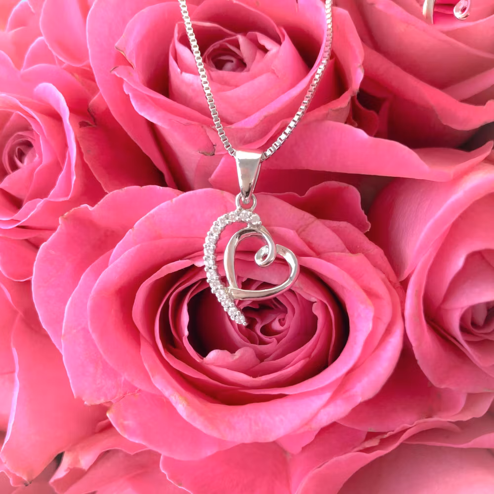 Här ett Sweethearts silverhalsband med ett sött hängande hjärta. Smycket behöver inte putsas eller blir missfärgat som andra silversmycken då det är Rhodiumpläterat vilket ger ett hållbart smycke med en exklusiv finish liknande vitguld eller platina. I smycket finns en lång rad glittrande Cubic Zirkonia vilket är den syntetiska sten som allra mest liknar en diamant.