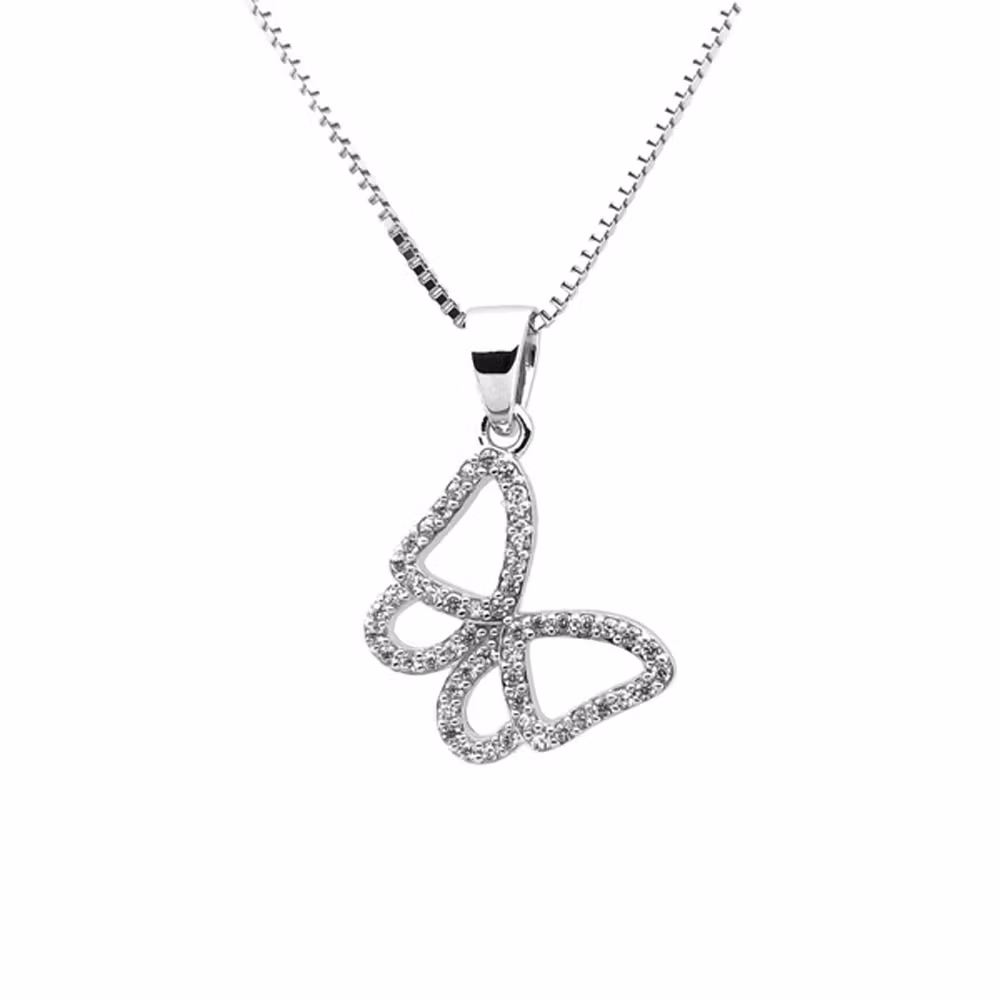 Här ett Sweethearts silverhalsband med en fin hängande fjäril. Smycket behöver inte putsas eller blir missfärgat som andra silversmycken då det är Rhodiumpläterat vilket ger ett hållbart smycke med en exklusiv finish liknande vitguld eller platina. I smycket finns en mängd glittrande Cubic Zirkonia vilket är den syntetiska sten som allra mest liknar en diamant.