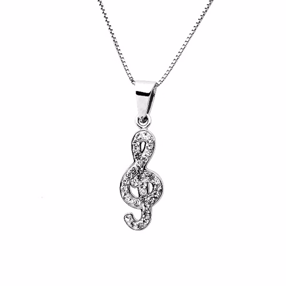 Här ett Sweethearts silverhalsband med en fin hängande g-klav. Smycket behöver inte putsas eller blir missfärgat som andra silversmycken då det är Rhodiumpläterat vilket ger ett hållbart smycke med en exklusiv finish liknande vitguld eller platina. I smycket finns en mängd glittrande kristaller av äkta Swarovski stenar.