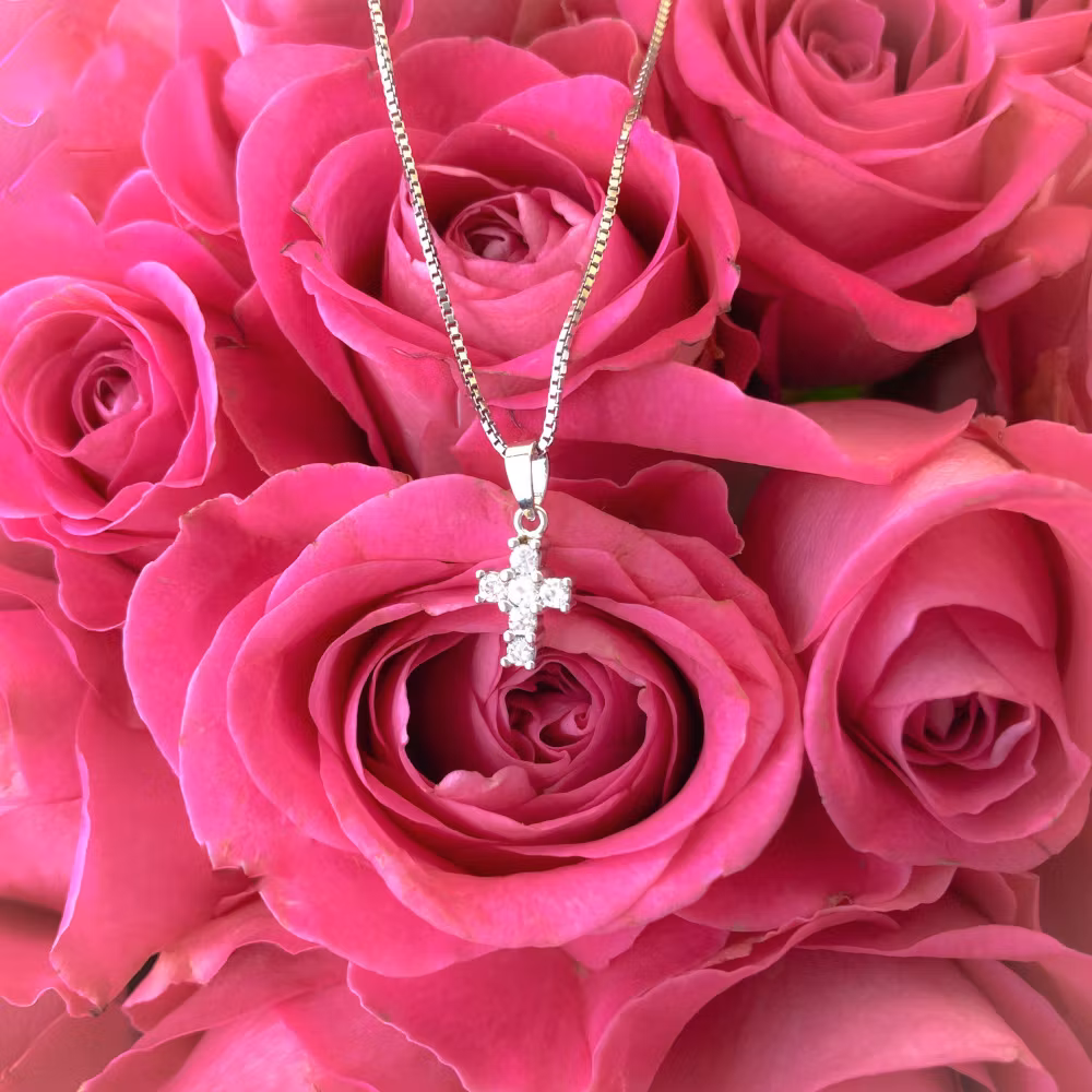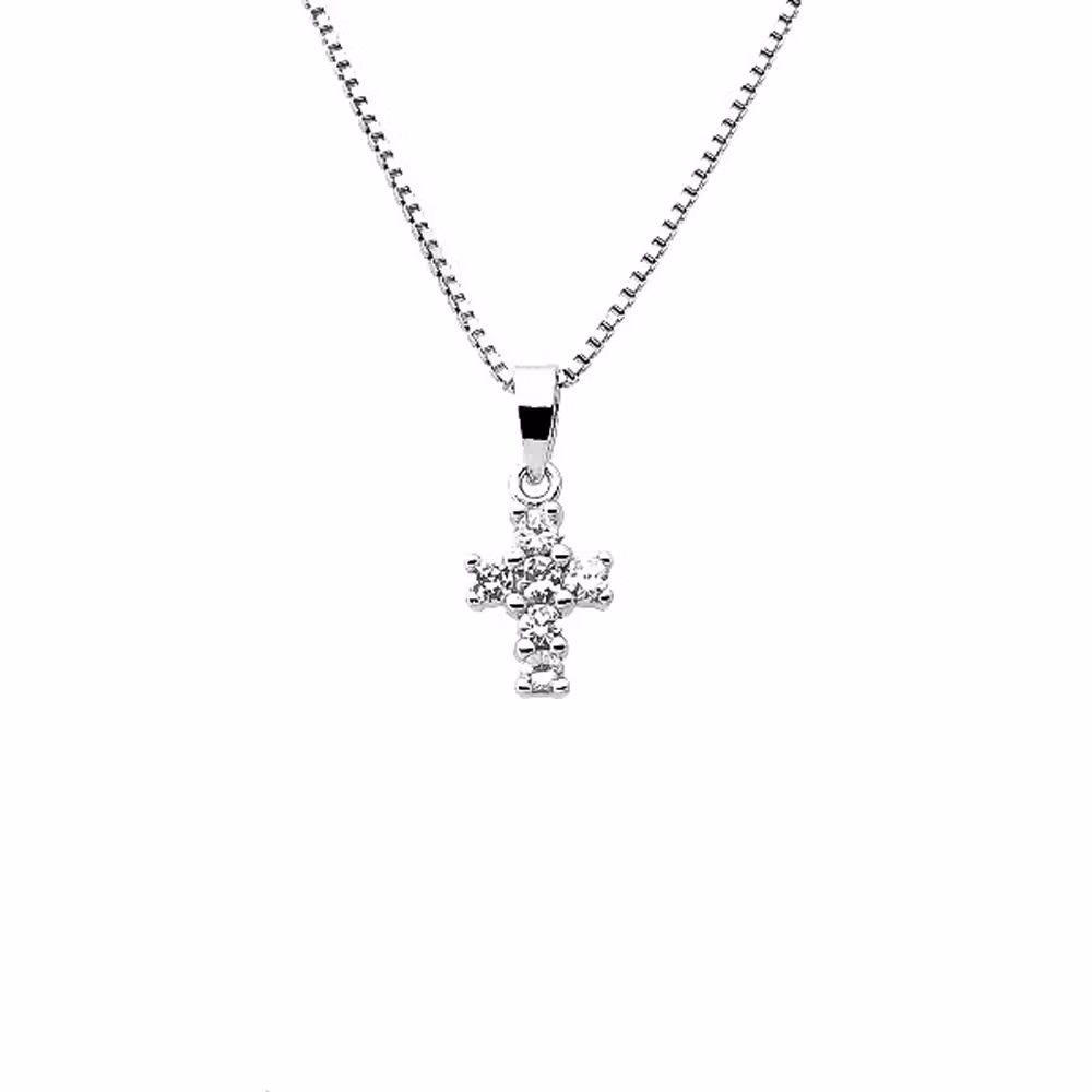 Här ett Sweethearts silverhalsband med ett sött hängande kors. Smycket behöver inte putsas eller blir missfärgat som andra silversmycken då det är Rhodiumpläterat vilket ger ett hållbart smycke med en exklusiv finish liknande vitguld eller platina. I smycket finns 6st lite större glittrande Cubic Zirkonia vilket är den syntetiska sten som allra mest liknar en diamant.