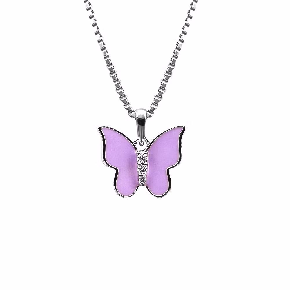 Barnhalsband i silver - söt ljuslila Fjäril med glittrande stenar