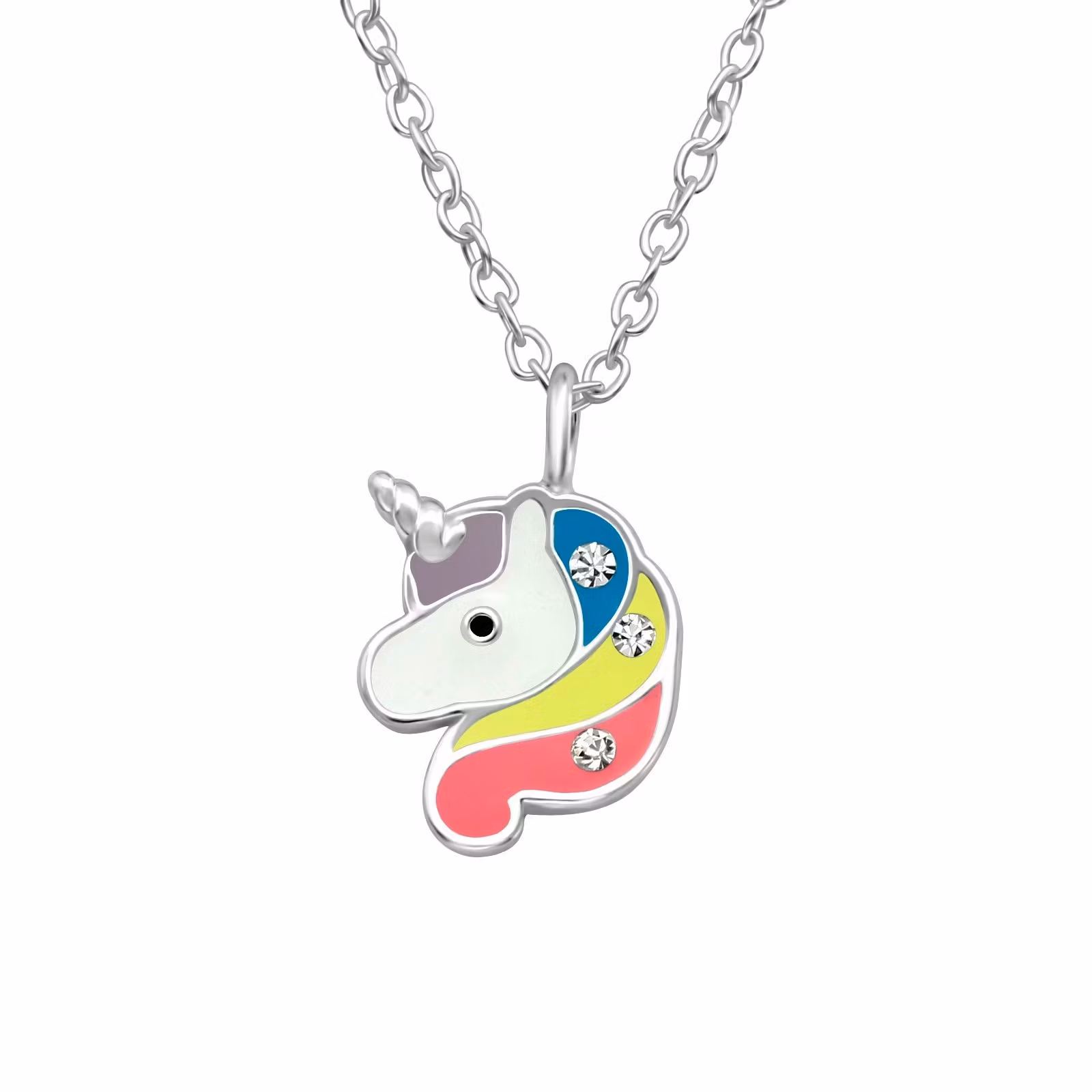 Sött halsband till barn i äkta 925 silver. Ett fint barnhalsband med en liten, gullig Enhörning i härliga färger som har ett silverhorn och tre stenar. Kedja medföljer, 36-39cm lång inklusive förlängningsdel. En kollektion med smycken i miniatyrstorlek som har fina och välgjorda detaljer.