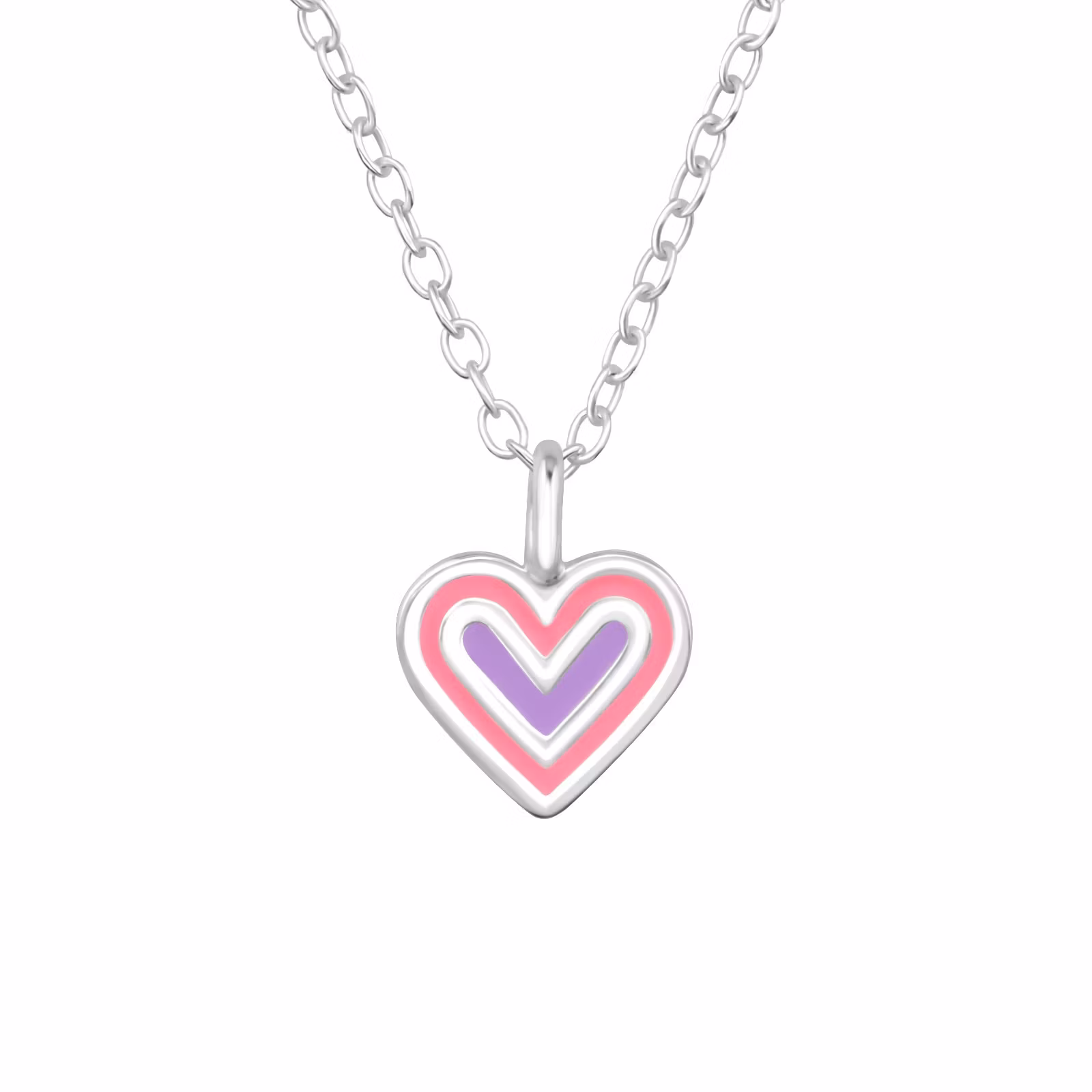Sött halsband till barn i äkta 925 silver. Ett fint halsband med ett litet, gulligt Hjärta i silver, rosa & lila. Kedja medföljer, 36-39cm lång inklusive förlängningsdel. En kollektion med smycken i miniatyrstorlek som har fina och välgjorda detaljer.