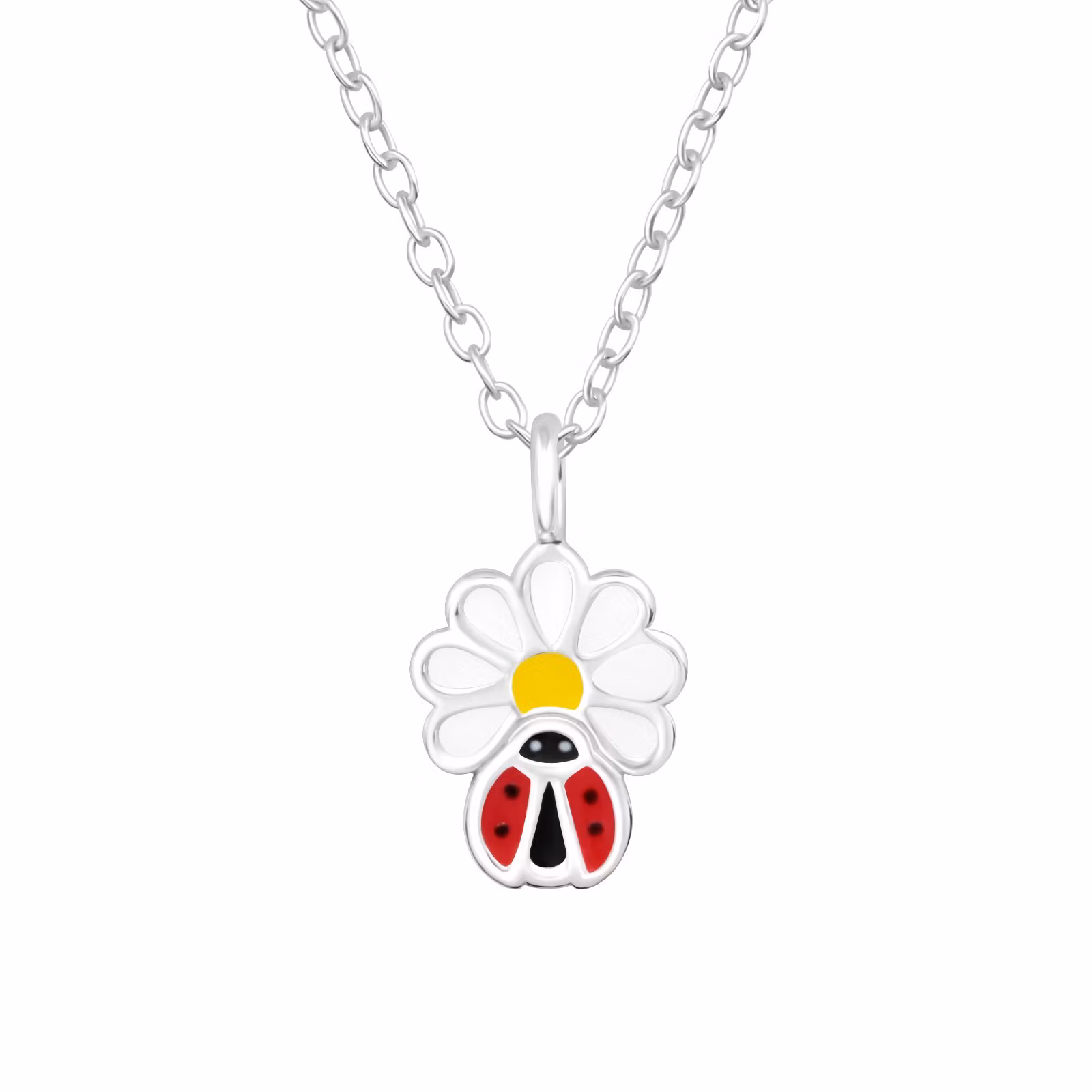 Sött halsband till barn i äkta 925 silver. Fint barnhalsband med en liten, gullig Blomma som har en Nyckelpiga som sitter på. Kedja medföljer, 36-39cm lång inklusive förlängningsdel. En kollektion med smycken i miniatyrstorlek som har fina och välgjorda detaljer.