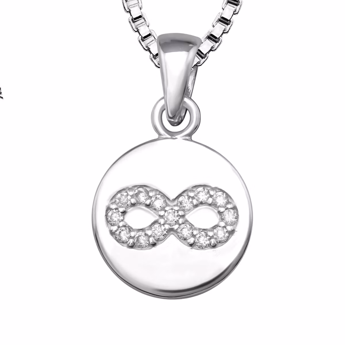 Fint halsband i äkta 925 sterling silver. Ett fint barnhalsband med en liten, rund platta med Evighetstecken i samma format som våra bokstavsberlocker, går fint att kombinera dessa. Halsband med evighetstecknet fyllt med glittrande cubic zirkonia stenar. Kedja i barnlängd medföljer, 35cm lång.. Ett välgjort silverhalsband som är lika fint att ge bort som present till barn eller vuxen.