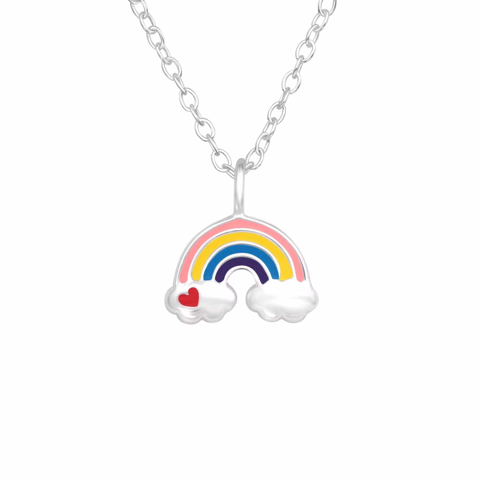 Sött halsband till barn i äkta 925 silver. Ett fint barnhalsband med en riktigt liten, gullig Regnbåge i fyra fina färger som vilar på två moln varav ett med ett litet rött hjärta på. Kedja medföljer, 36-39cm lång inklusive förlängningsdel. En kollektion med smycken i miniatyrstorlek som har fina och välgjorda detaljer.