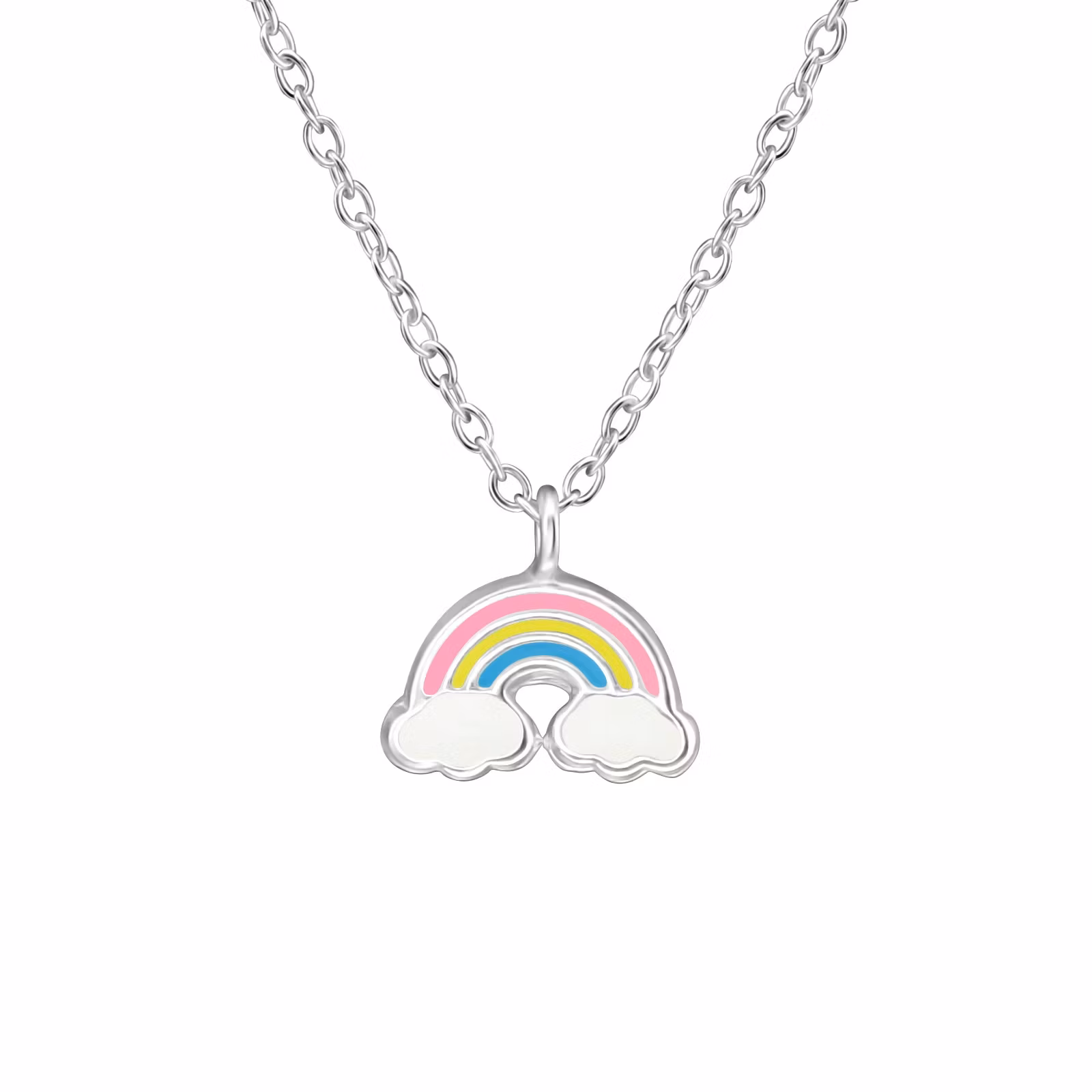 Sött halsband till barn i äkta 925 silver. Ett fint barnhalsband med en liten, gullig Regnbåge i tre pastellfärger som vilar på två vita moln. Kedja medföljer, 36-39cm lång inklusive förlängningsdel. En kollektion med smycken i miniatyrstorlek som har fina och välgjorda detaljer.