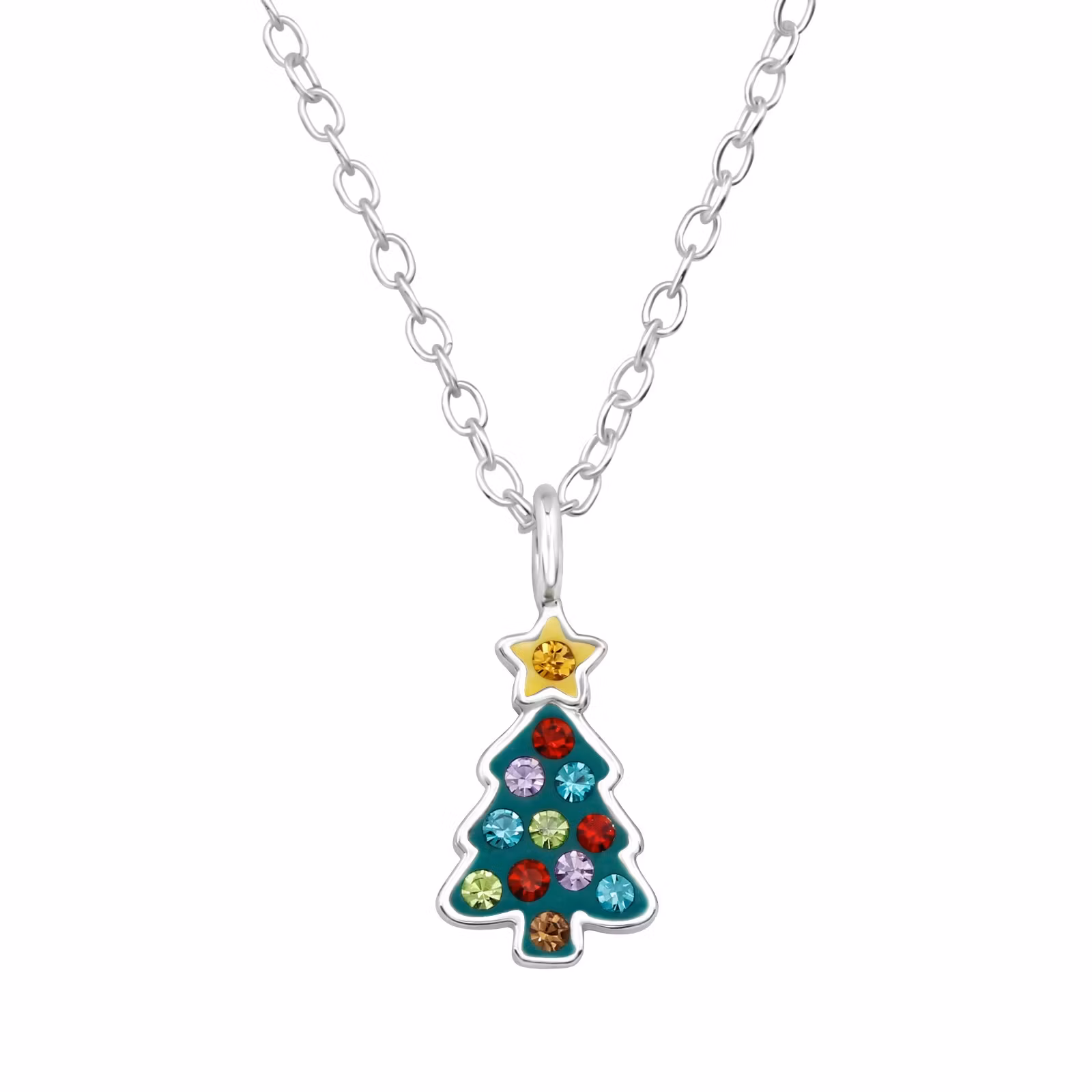 Sött julhalsband till barn i äkta silver. Fint julsmycke med en liten gullig, grön Julgran. Fraktmöjlighet och Presentask.