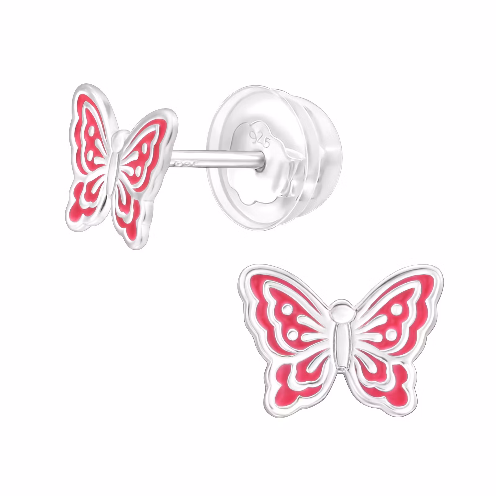 Söta örhängen till barn i äkta silver. Fina barnörhängen med små ceriserosa Fjärilar. Fri Fraktmöjlighet och Presentask. Dessa örhängen har bakploppar i silver som har ett överdrag i silikon så att örhänget smidigt och bekvämt sitter på plats.