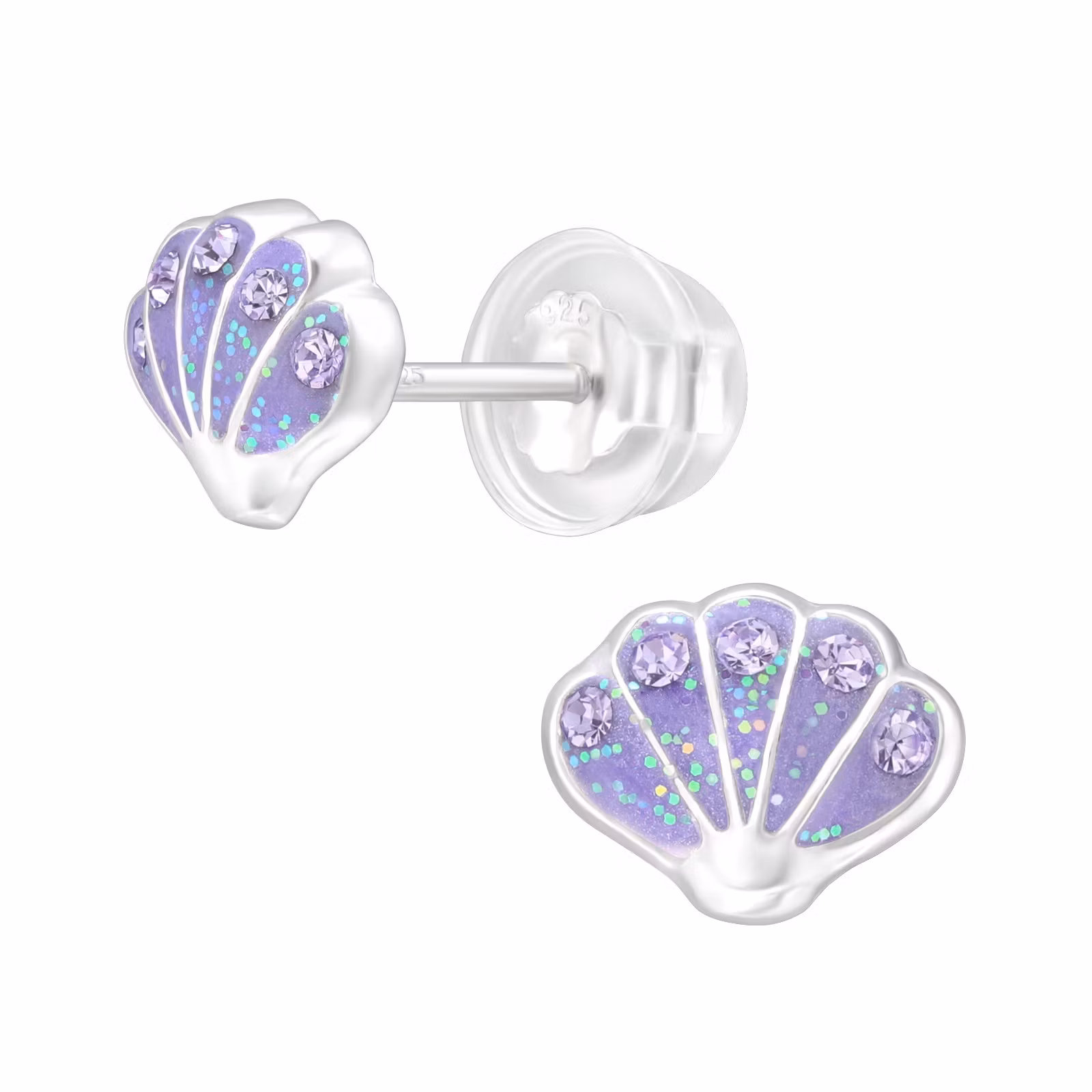 Söta örhängen till barn i äkta silver. Fina barnörhängen små lila Snäckor med glitter. Fri Fraktmöjlighet och Presentask. Dessa örhängen har bakploppar i silver som har ett överdrag i silikon så att örhänget smidigt och bekvämt sitter på plats.
