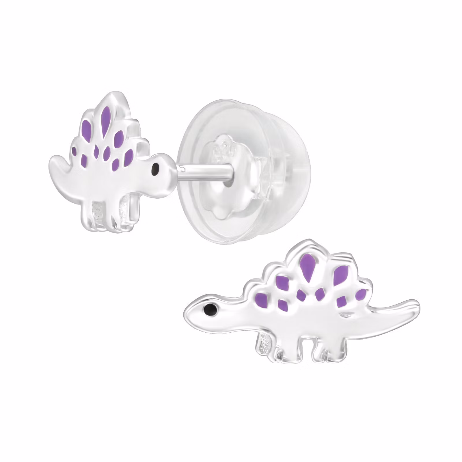 Söta örhängen till barn i äkta silver. Fina barnörhängen med små, gulliga Dinosaurier i silver och lila. Fri Fraktmöjlighet och Presentask. Dessa örhängen har bakploppar i silver som har ett överdrag i silikon så att örhänget smidigt och bekvämt sitter på plats.
