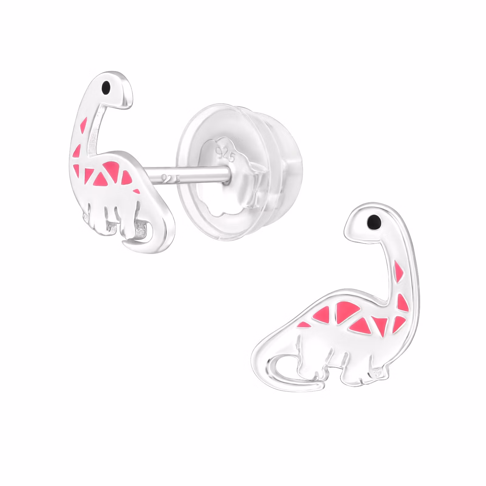 Söta örhängen till barn i äkta silver. Fina barnörhängen med små, gulliga Dinosaurier i silver och rosa. Fri Fraktmöjlighet och Presentask. Dessa örhängen har bakploppar i silver som har ett överdrag i silikon så att örhänget smidigt och bekvämt sitter på plats.