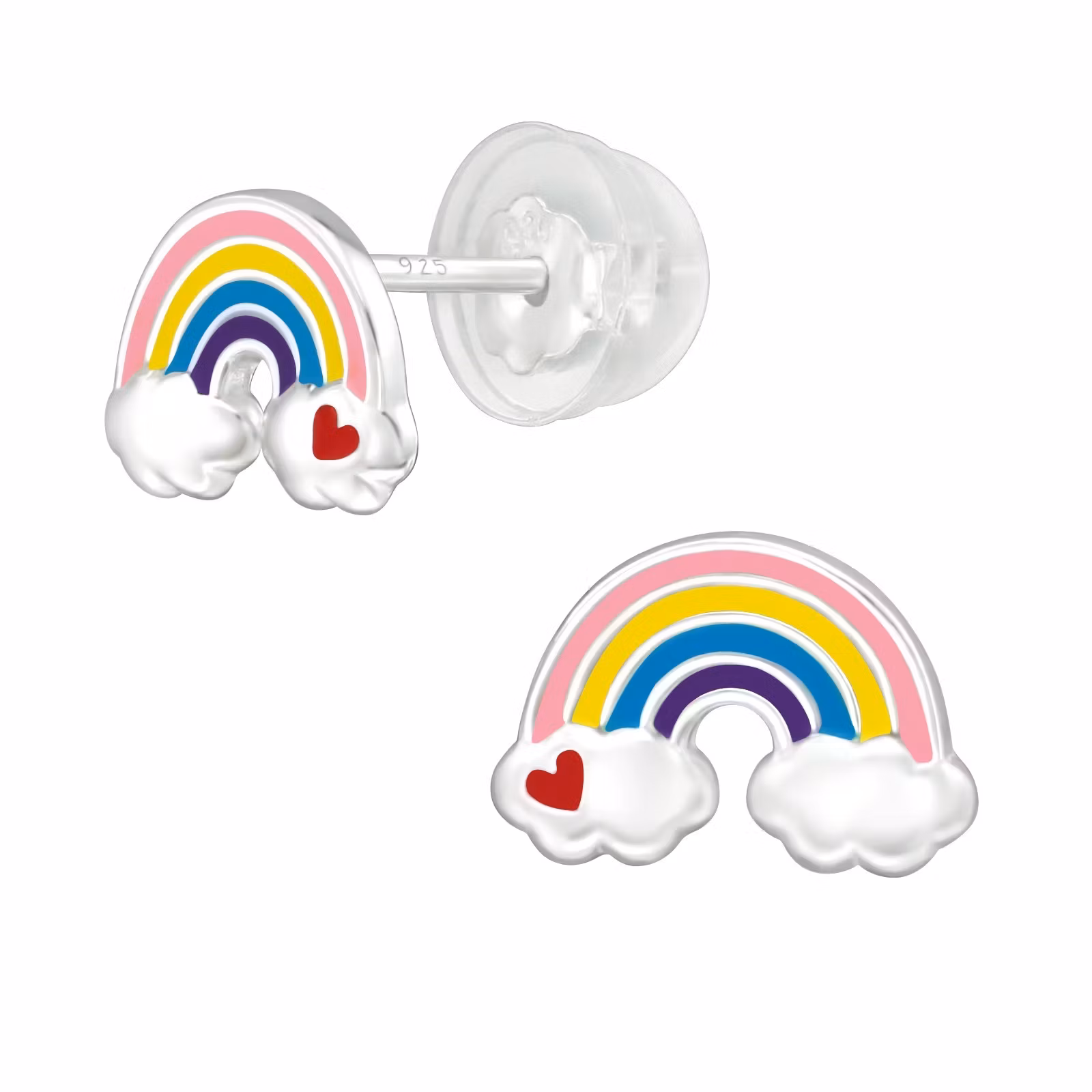 Söta örhängen till barn i äkta silver. Fina barnörhängen med små, gulliga Regnbågar med moln och litet rött hjärta. Fri Fraktmöjlighet och Presentask. Dessa örhängen har bakploppar i silver som har ett överdrag i silikon så att örhänget smidigt och bekvämt sitter på plats.