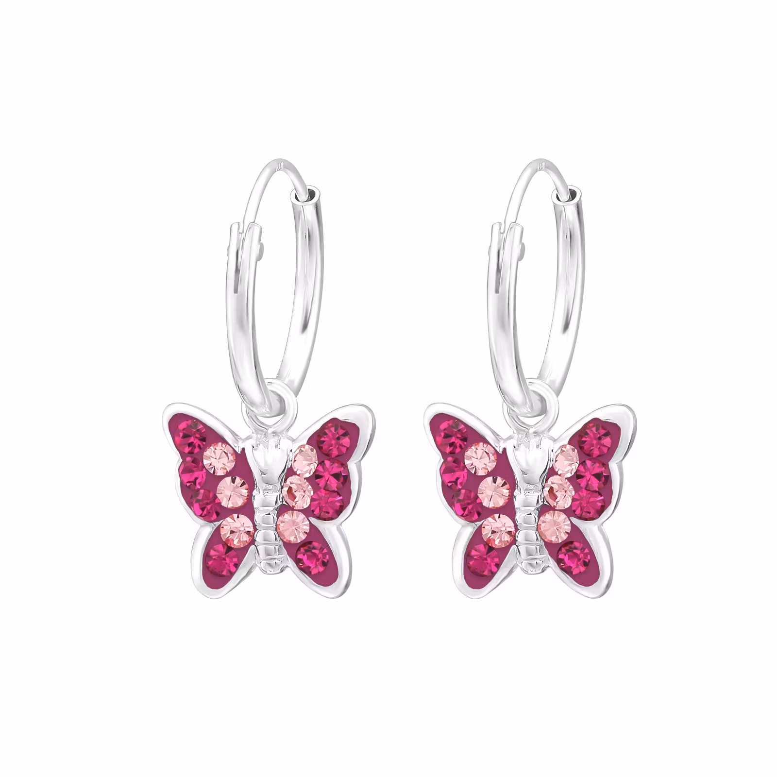 Söta hängande örhängen till barn i äkta silver. Fina barnörhängen med ringar som har små Fjärilar i rosa med glitterstenar. Fri Fraktmöjlighet och Presentask.
