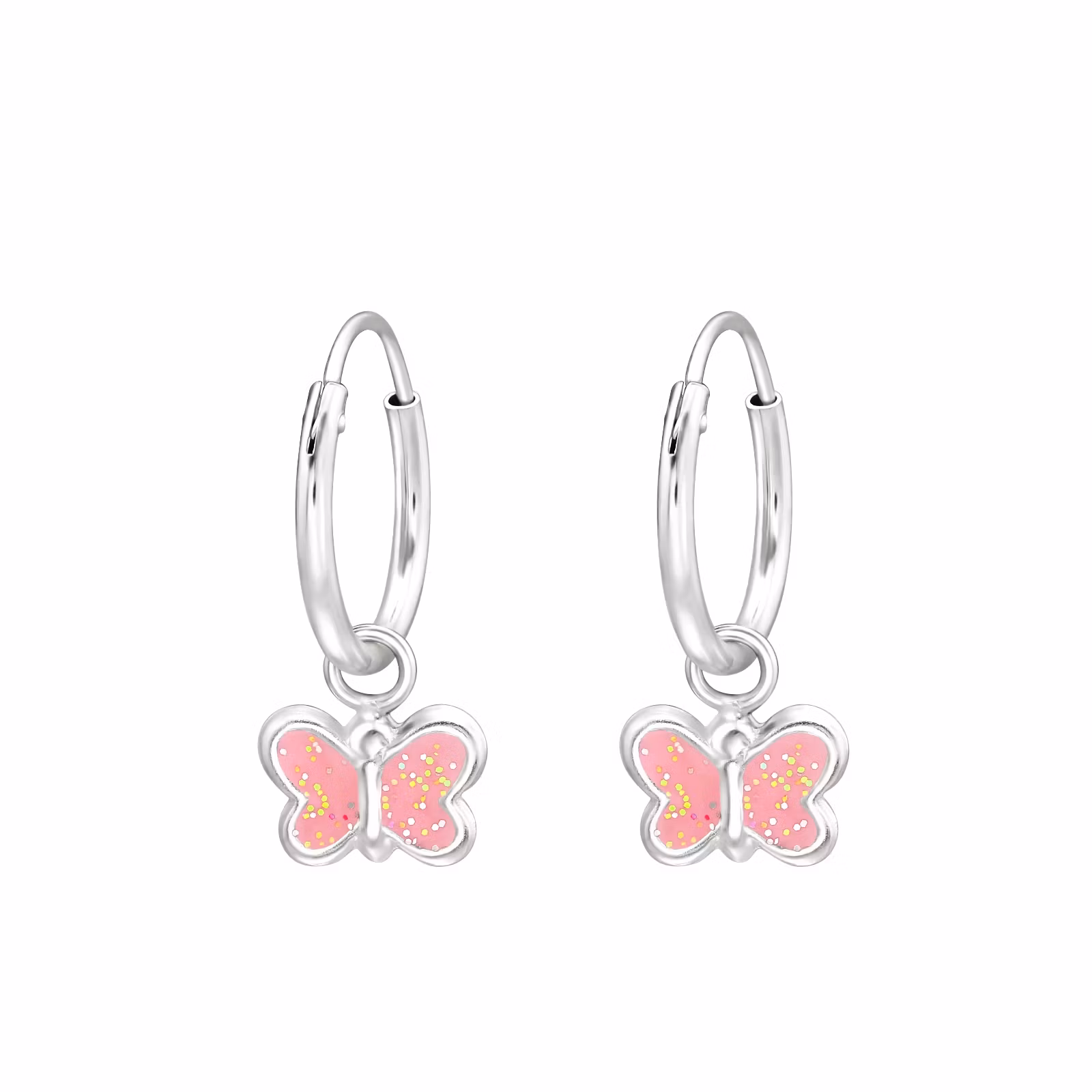 Söta hängande örhängen till barn i äkta silver. Fina barnörhängen med ringar som har små, gulliga Fjärilar i ljusrosa med glitter. Fri Fraktmöjlighet och Presentask.