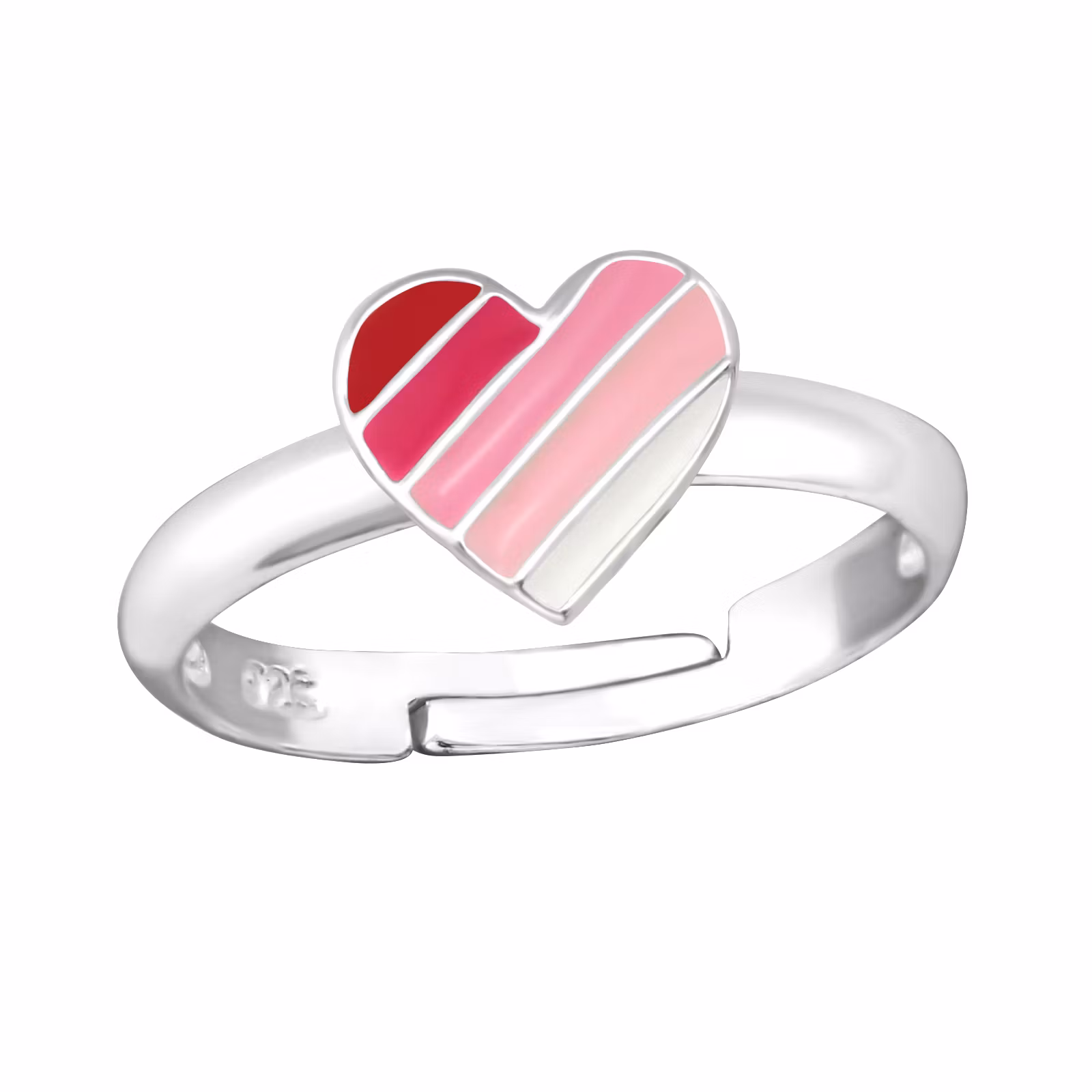 Söt ring till barn i äkta silver. Fin barnring med randigt Hjärta i vitt, rosa och rött.. En justerbar ring. Fri Fraktmöjlighet och Presentask.