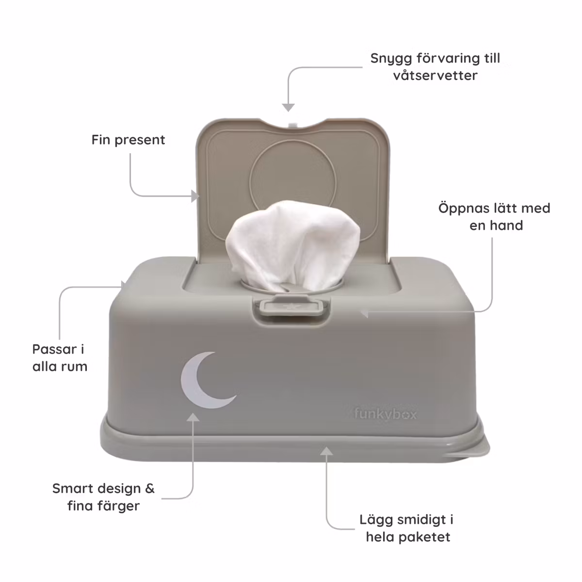 Funkybox är självklart val att förvara våtservetterna i så att de finns nära till hands vid blöjbyte. Placera i anslutning till skötbord eller skötunderlägg. Även jättebra att ha en Funkybox i köket så att barnet lätt kan torka bort kladd efter måltid och mellanmål. Funkybox finns i en originalstorlek samt i en mindre storlek, Funkybox ToGo som kan vara bra att ha med sig eller placera t.ex i bilen. Flytta gärna över paketet med våtservetter från den vanliga asken till den mindre när det endast är lite mindre kvar i paketet. Vi rekommenderar att du placerar paketet med våtservetter direkt i din Funkybox utan att ta ut servetterna, på så sätt håller de sig fuktiga länge. Du öppnar lätt din Funkybox med en hand och drar ut våtvervetter efter behov. Välj färger och placera ut i badrum, barnrum, kök och överallt där en våtservett kan komma till användning!