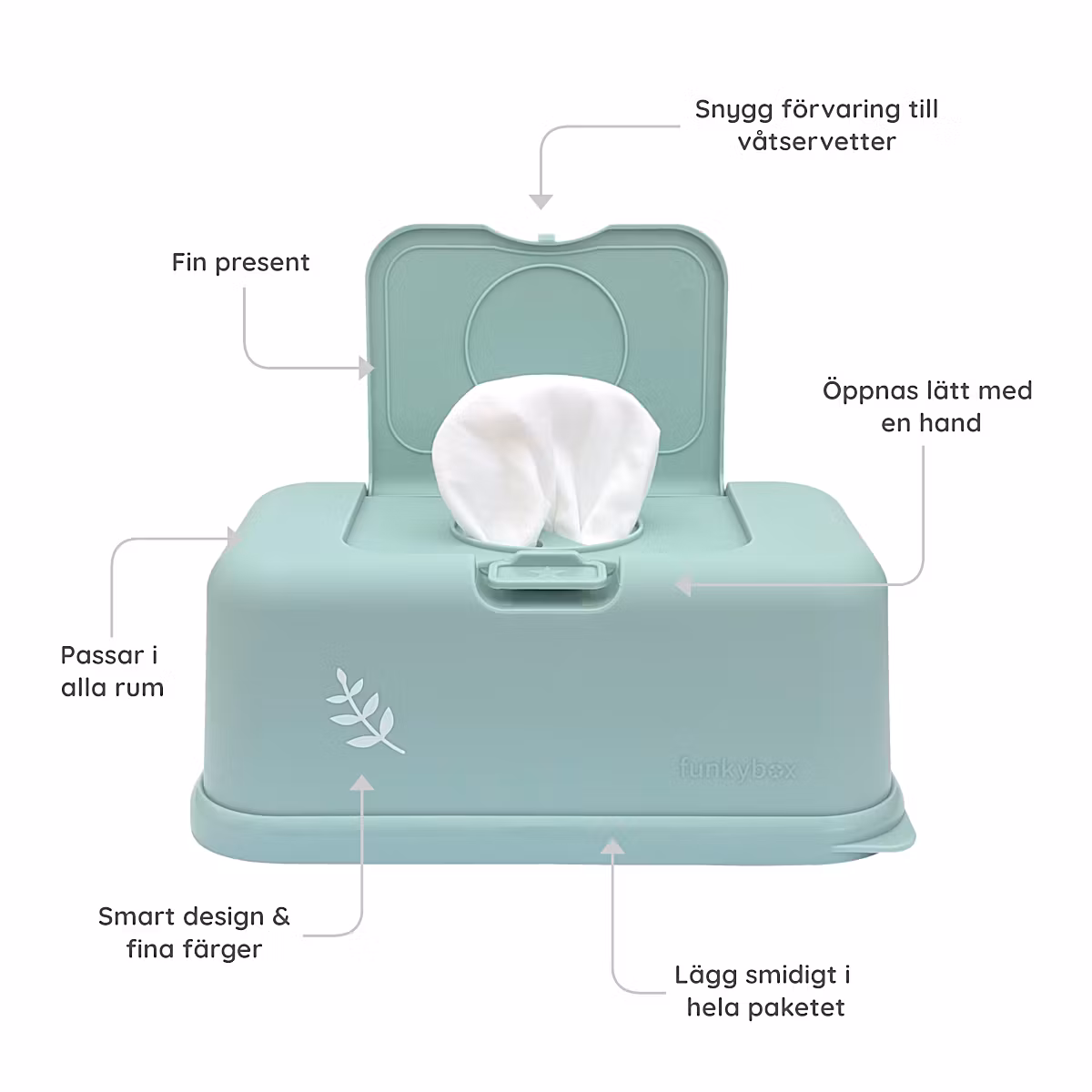 Funkybox är självklart val att förvara våtservetterna i så att de finns nära till hands vid blöjbyte. Placera i anslutning till skötbord eller skötunderlägg. Även jättebra att ha en Funkybox i köket så att barnet lätt kan torka bort kladd efter måltid och mellanmål. Funkybox finns i en originalstorlek samt i en mindre storlek, Funkybox ToGo som kan vara bra att ha med sig eller placera t.ex i bilen. Flytta gärna över paketet med våtservetter från den vanliga asken till den mindre när det endast är lite mindre kvar i paketet. Vi rekommenderar att du placerar paketet med våtservetter direkt i din Funkybox utan att ta ut servetterna, på så sätt håller de sig fuktiga länge. Du öppnar lätt din Funkybox med en hand och drar ut våtvervetter efter behov. Välj färger och placera ut i badrum, barnrum, kök och överallt där en våtservett kan komma till användning!