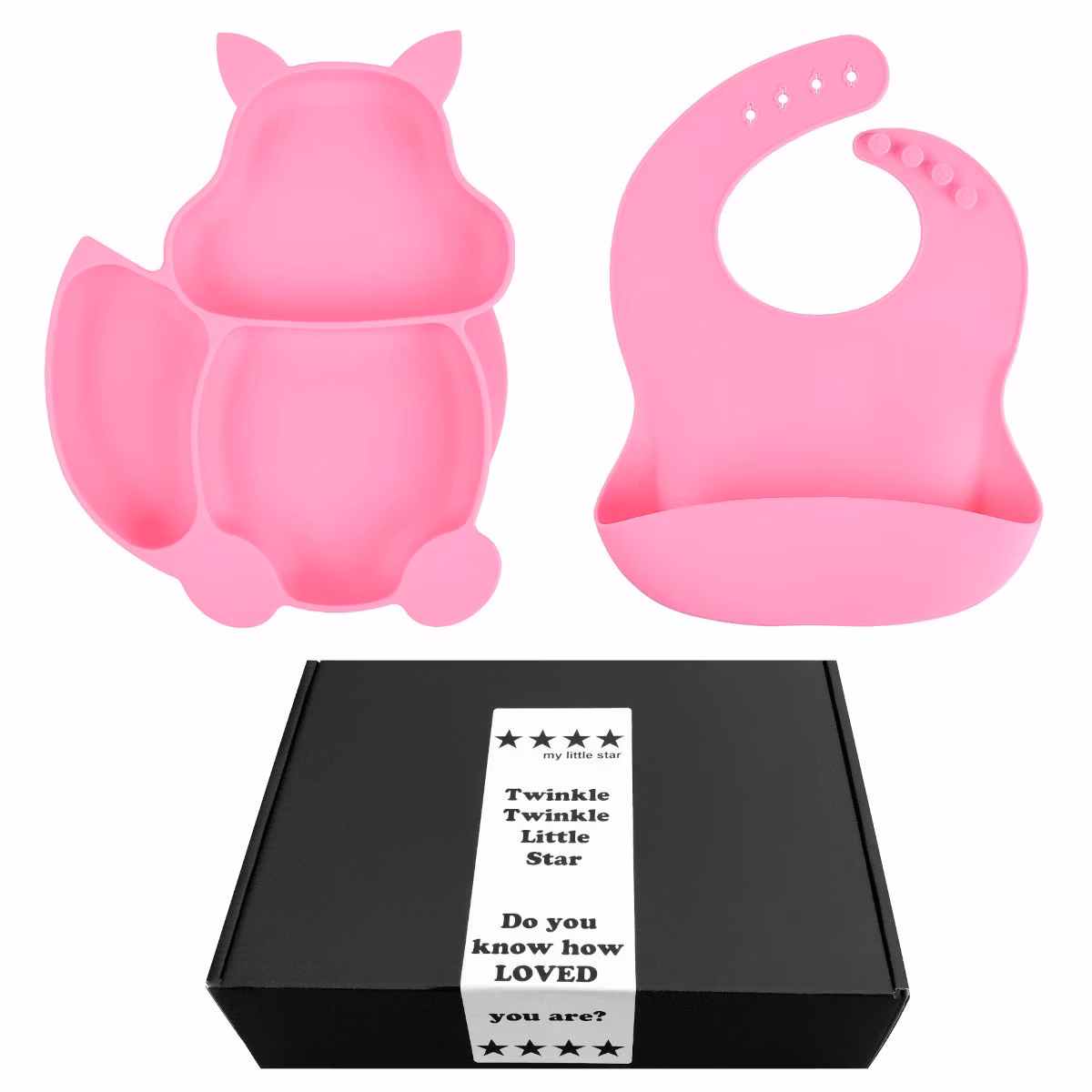 Tallrik & Haklappsset till bebis i Silikon. En rosa tallrik i form av Ekorre med matchande haklapp från My Little Star i fin presentask.
