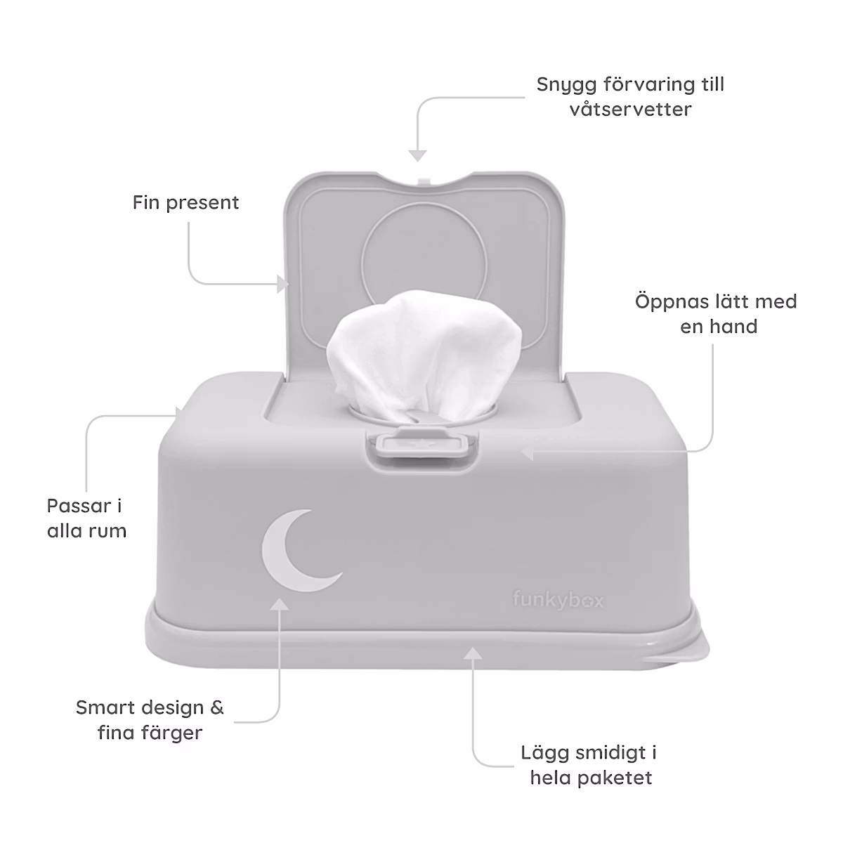 Funkybox är självklart val att förvara våtservetterna i så att de finns nära till hands vid blöjbyte. Placera i anslutning till skötbord eller skötunderlägg. Även jättebra att ha en Funkybox i köket så att barnet lätt kan torka bort kladd efter måltid och mellanmål. Funkybox finns i en originalstorlek samt i en mindre storlek, Funkybox ToGo som kan vara bra att ha med sig eller placera t.ex i bilen. Flytta gärna över paketet med våtservetter från den vanliga asken till den mindre när det endast är lite mindre kvar i paketet. Vi rekommenderar att du placerar paketet med våtservetter direkt i din Funkybox utan att ta ut servetterna, på så sätt håller de sig fuktiga länge. Du öppnar lätt din Funkybox med en hand och drar ut våtservetter efter behov. Välj färger och placera ut i badrum, barnrum, kök och överallt där en våtservett kan komma till användning!