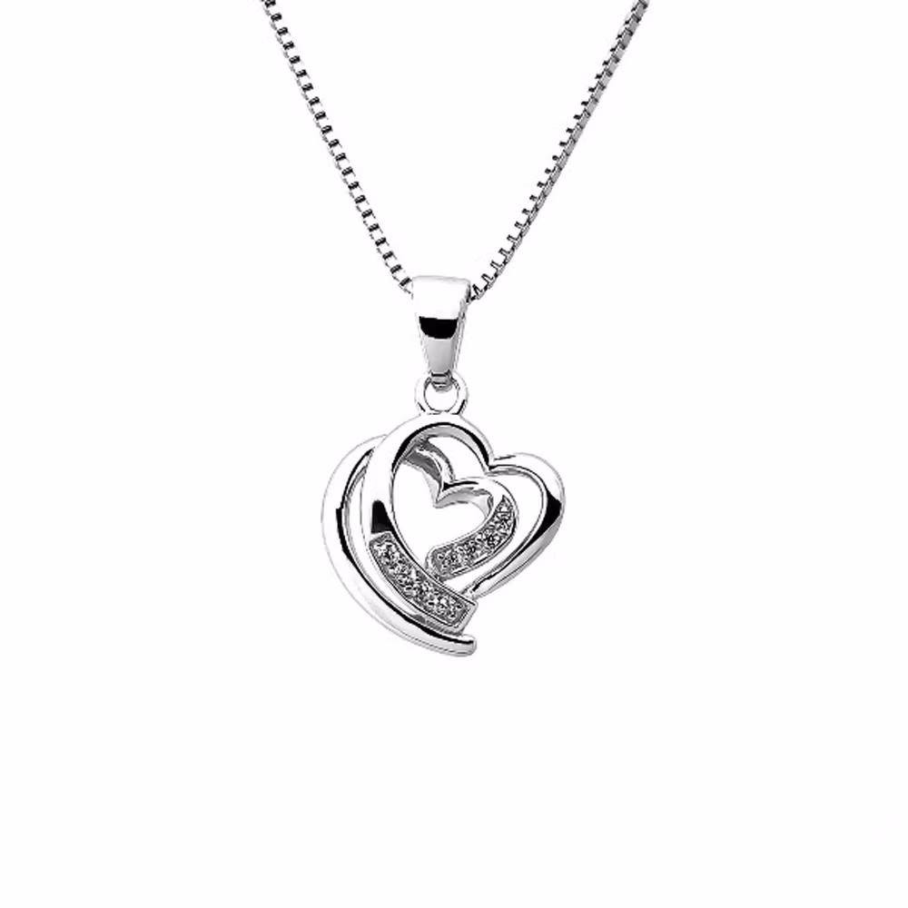Fint silverhalsband i äkta 925 silver. Ett vackert smycke med ett fint hängande Silverhjärta som består av två hjärtan. En elegant design med glittrande Cubic Zirkonia stenar. Rhodiumpläterad exklusiv finish liknande vitguld och platina. Kedja medföljer välj mellan två längder, 36cm om halsbandet är till ett barn eller 45cm om det är till en vuxen.. Ett halsband som är fint att ge bort som present till någon man tycker om eller att köpa till dig själv!