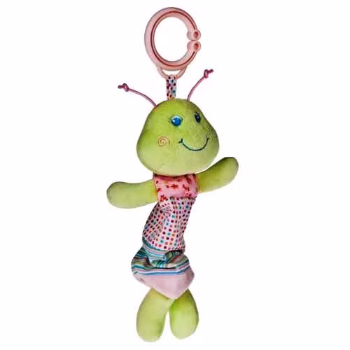 Babypresent eller Doppresent. Barnvagnsleksak från Mary Meyer som tillverkat Gosedjur & Babyleksaker av högsta klass sedan 1933. Företaget Mary Meyer startades av just Mary Meyer med man Hans Meyer 1933 i Vermont, USA. Sedan dess har man med hjärtat tillverkat gosedjur & babyleksaker med det lilla extra. Mary själv var aktiv i företaget till 78 års ålder då hon gick i pension men fortsatte att besöka fabriken som drivits vidare av barn och barnbarn. Hon blev 94 år gammal och företaget har fortsatt drivas i hennes anda. Målet är alltid att tillverka väl designade, vackra, säkra och lärorika mjuka babyleksaker & gosedjur. Här en barnvagnsleksak som dras ut och "wigglar" upp igen med en plingande bjällra inuti. Ett barnvagnshänge ca 25 cm i utdragen längd. Mjukisdjur till någon speciell.