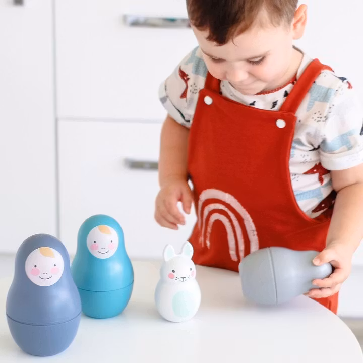 En designad, prisbelönt babyleksak med tre överraskningsdockor och en fin kaninskallra i mitten.