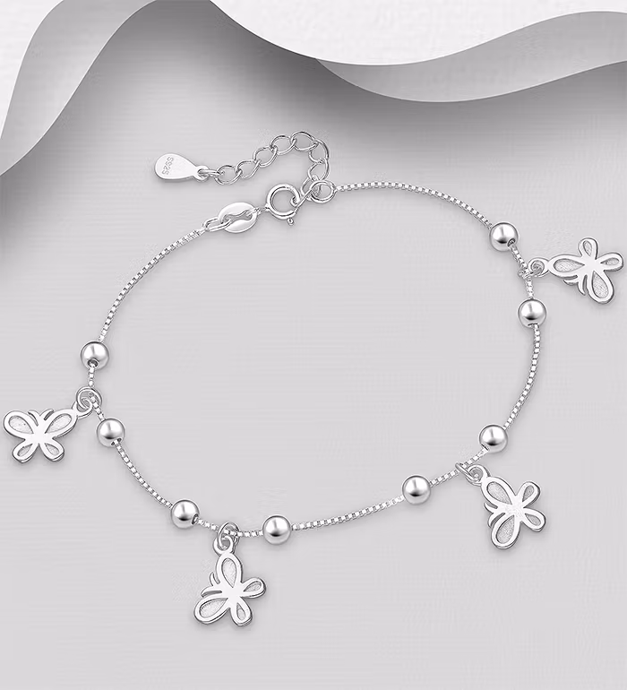 Fint silverarmband i äkta silver. Vackert armband som har silverkulor samt hängande berlocker i form av söta fjärilar. Fri Fraktmöjlighet och Presentask. Ett elegant och välgjort armband som är fint att ge bort som present eller att köpa till dig själv.