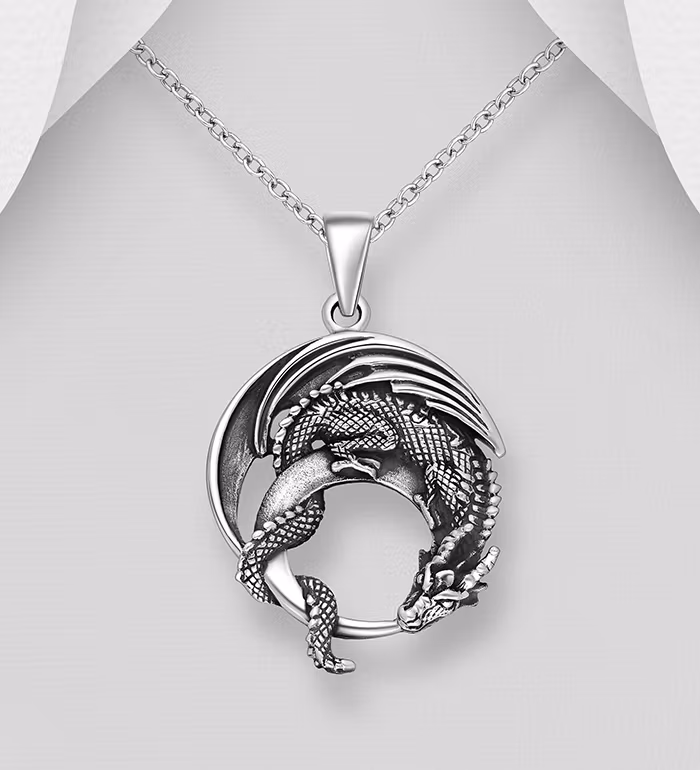 Fint silverhalsband till kille/ herr i äkta 925 silver. Ett medaljongsmycke med en slingrande Drake i oxiderat silver. Fri Fraktmöjlighet och Presentask.